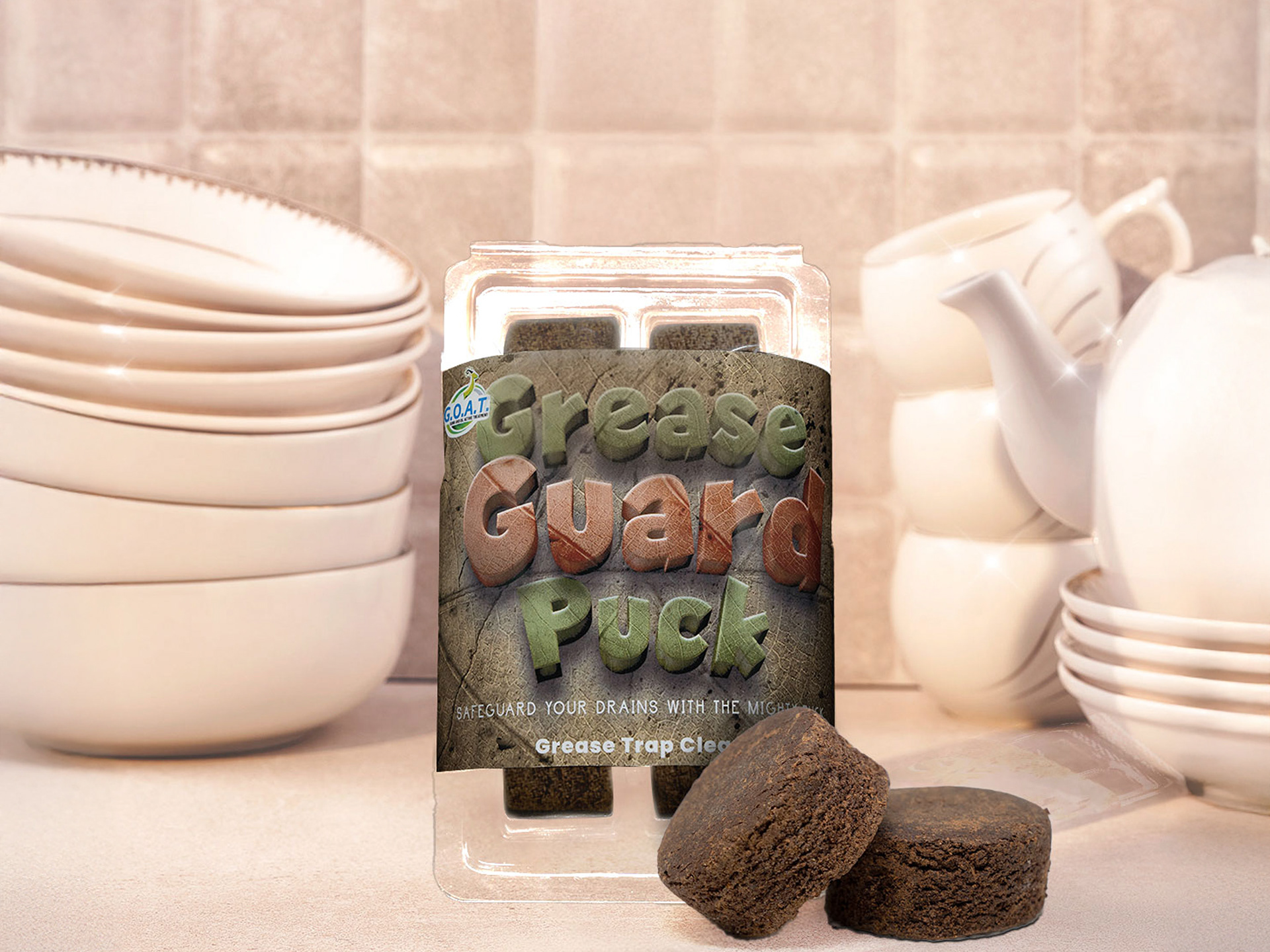 The G.O.A.T. Grease Guard Puck is a revolutionary and organic solution that digests Fat, Oil, and Grease (FOGs) without the use of harsh chemicals. Just drop the puck into your grease trap (where FOG accumulates) and its time-release formula works for days without reopening your grease trap.